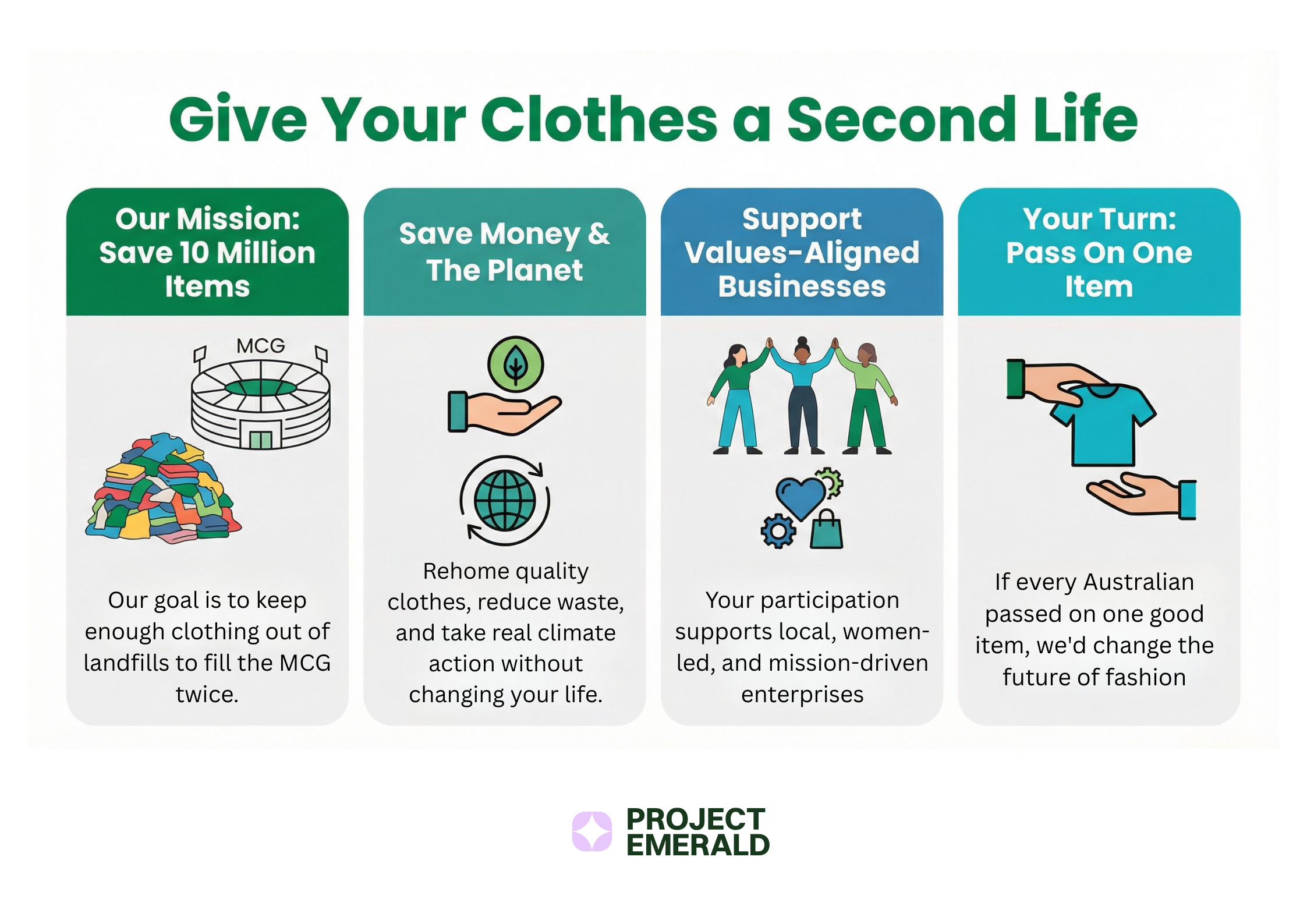 By making it simple, trusted, and genuinely enjoyable to buy and sell secondhand quality fashion items, Project Emerald helps Australians: